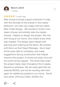 I am not normally one to post a recommendation, but given this wonderful experience I had with BCDG, I felt compelled to let the community know. BCDG is a company based out of Evergreen that specializes in home remodels. I randomly met the owner Doug and his wife at an open house in Cherry Creek. BCDG is growing their business and have become popular in Denver, specifically the Cherry Creek North neighborhood. I took his card because my mother was interested in remodeling her condominium in CCN. We decided to hire Doug and his team to do a complete overhaul of my mother's unit, including kitchen and bath. I can't begin to say enough amazing things about this company. From the job foreman to the subcontractors, BCDG delivered in every way possible. I was able to reach the job foreman literally at any time during the day via text or phone call. There was ALWAYS someone on site at the condominium and the team is incredibly hardworking. The level of craftsmanship and expertise was also impeccable. I would recommend this team to anyone interested in any type of remodel, even if it is just retiling your bathroom. BCDG had over 40 projects during the time they remodeled my mother's unit, but it felt like we were the only job they had. The customer service of this company is impressive. BCDG was also featured on HGTV.