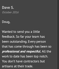 Wanted to send you a little feedback. So far your team has been outstanding. Every person that has come through has been so professional and respectful. All the work to date has been top notch. You don’t have contractors but artisans at their trade.