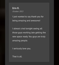 To say 'Thank you' isn't nearly what I feel inside. To respond to me the way you did with such graciousness absolutely blows me away. It's rare to meet a guy like yourself that truly cares and is willing to go above and beyond to make another comfortable in their home. It's an honor to know you and I'm incredibly grateful for your time and effort. Like I told you, people are usually trying to evade people in situations like mine, when you came looking for me. I've told so many people about you including my mom and dad, and they were in disbelief. My girlfriend was also very grateful to you as elk, and couldn't believe it. Your integrity is second to none.
