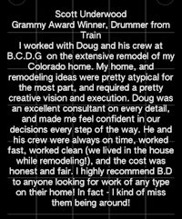 I am not normally one to post a recommendation, but given this wonderful experience I had with BCDG, I felt compelled to let the community know. BCDG is a company based out of Evergreen that specializes in home remodels. I randomly met the owner Doug and his wife at an open house in Cherry Creek. BCDG is growing their business and have become popular in Denver, specifically the Cherry Creek North neighborhood. I took his card because my mother was interested in remodeling her condominium in CCN. We decided to hire Doug and his team to do a complete overhaul of my mother's unit, including kitchen and bath. I can't begin to say enough amazing things about this company. From the job foreman to the subcontractors, BCDG delivered in every way possible. I was able to reach the job foreman literally at any time during the day via text or phone call. There was ALWAYS someone on site at the condominium and the team is incredibly hardworking. The level of craftsmanship and expertise was also impeccable. I would recommend this team to anyone interested in any type of remodel, even if it is just retiling your bathroom. BCDG had over 40 projects during the time they remodeled my mother's unit, but it felt like we were the only job they had. The customer service of this company is impressive. BCDG was also featured on HGTV.