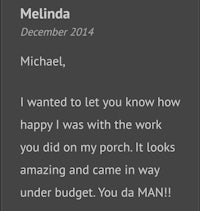 I'm so glad we met and I'm looking forward to your company making my home even better. I know your reputation and work stand for themselves, but at any time please feel free to use me as a reference. I don't forget when people do wonderful things for me, and if there is ever something I can do for you as a favor, don't hesitate to call on me. I hope we can go grab a beer or three when I get back. Thank you so much Doug!